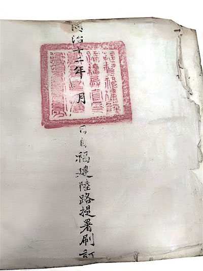 罗洪早父亲,名永坤,78岁的他非常热情地接待了我们。《罗氏宗谱》以木板做封面,一共8册,打开封面,展现眼前的是“福建陆路提督”汉满两种文字朱砂印,印下面是“同治十二年 月 日自福建陆路提督署刷订”,这立即让我们4人震惊了——是罗大春修的谱。